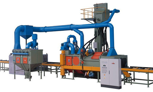 辊道式抛丸机清理过程中由电气控制的可调速输送辊道将钢结构件或钢材送进清理机室体内抛射区,辊道式抛丸机其周身各面受到来自不同坐标方位的强力密集弹丸打击与磨擦,使之其上的氧化皮、锈层及其污物迅速脱落,钢材表面就获得一定粗糙度的光洁表面,在辊道式抛丸机清理室外两边进出口辊道装卸工件,落入钢材上面的弹丸与锈尘经吹扫装置吹扫,撒落下来的丸尘混合物由回收螺旋输送到室体漏斗、纵横向螺旋输送机汇集于提升机下部,再提升到辊道式抛丸机机器上部的分离器里,分离后的纯净弹丸落入分离器料斗中内,供抛丸循环使用。辊道式抛丸机抛丸清理中产生尘埃,由抽风管送向除尘系统,净化处理后的净气排放到大气中,颗粒状尘埃被捕捉收集。