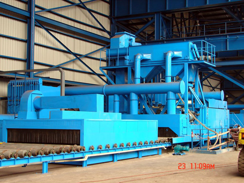 钢材预处理线是将钢材在焊接加工前进行表面抛丸除锈并涂上一层保护底漆的设备,设备全长约70米,里约150吨,该设备由送进辊道、雨污清扫装置、预热室、抛丸除锈系统、丸料清扫室、中间辊道、喷漆室、烘干室、编码打印、送出辊道、抛丸除尘系统、漆雾处理系统及电控系统等组成。钢材经过预处理可以提高机械产品和金属构件的抗腐蚀能力,提高钢板的抗疲劳性能,延长其使用寿命;同时还可以优化钢材表面工艺制作状态,有利于数控切割机下料和精密落料。此外,由于加工的钢材形状比较规则,有利于机械除锈和自动化喷漆,因此采用钢材预处理可大大提高清理工作的效率,减轻清理工作的劳动强度和对环境的污染。近几年,由于采用可编程序控制器控制,设备的自动化程度得到更大程度的提高。